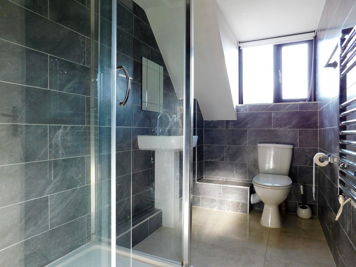 Upstairs there are two bedrooms, the master with fitted wardrobes, and the single room perfect for use as a study, or a kids room. There is a contemporary shower room which is fully tiled with large shower cubicle. There is also an airing cupboard and loft storage.
