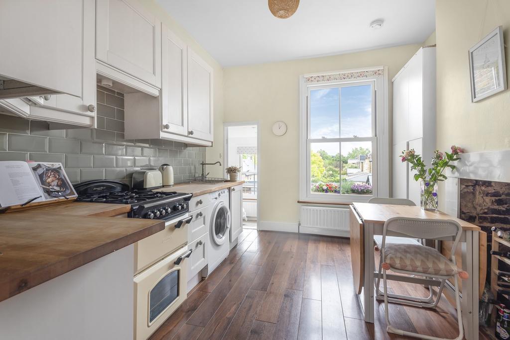 Positioned on the 1st floor, the entrance has two storage cupboards which then leads into the bright and roomy living room with alcove shelving and cabinet, period fireplace and stunning bay window. The kitchen is spacious with solid oak worktops, plenty of room for a dining table and provides ample storage.